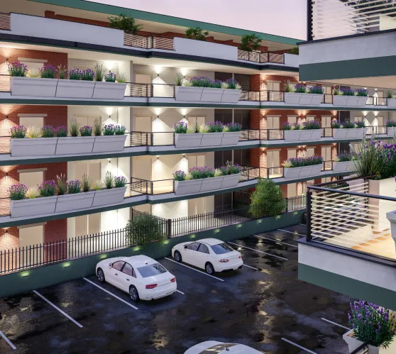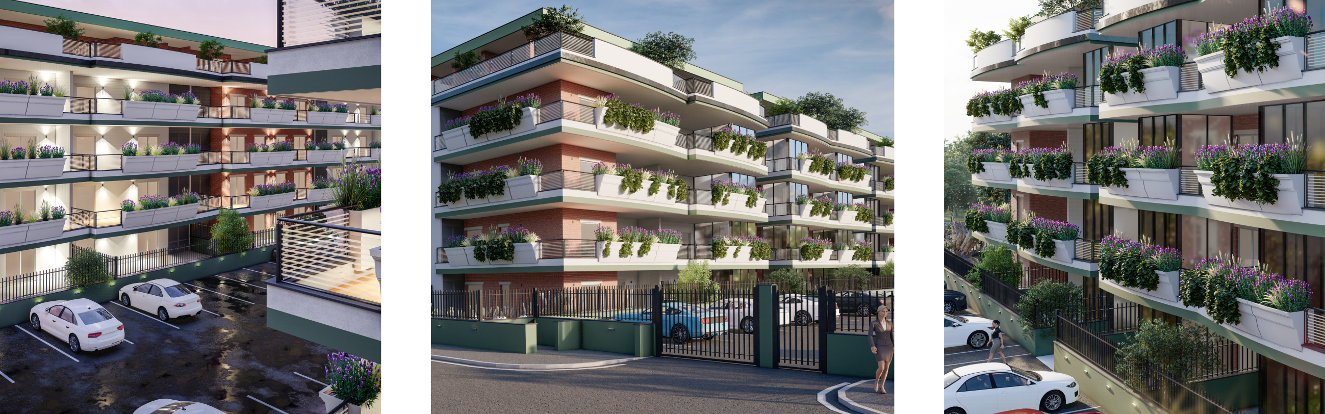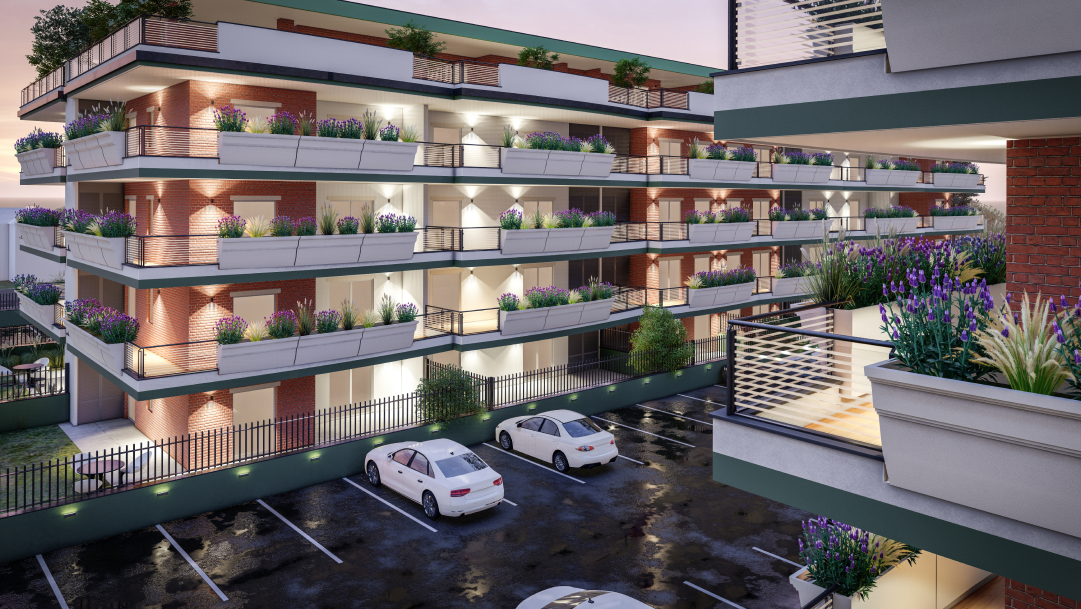 Ogni appartamento dispone di un posto auto di pertinenza, ascensore, videocitofono a colori e accessi progettati per garantire praticità e sicurezza