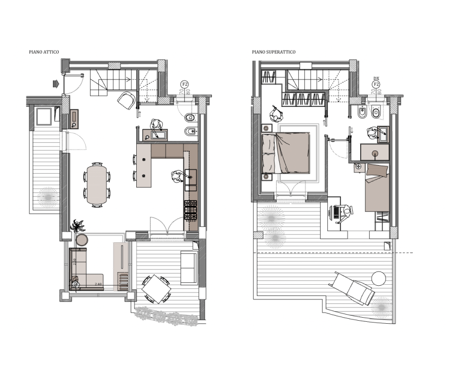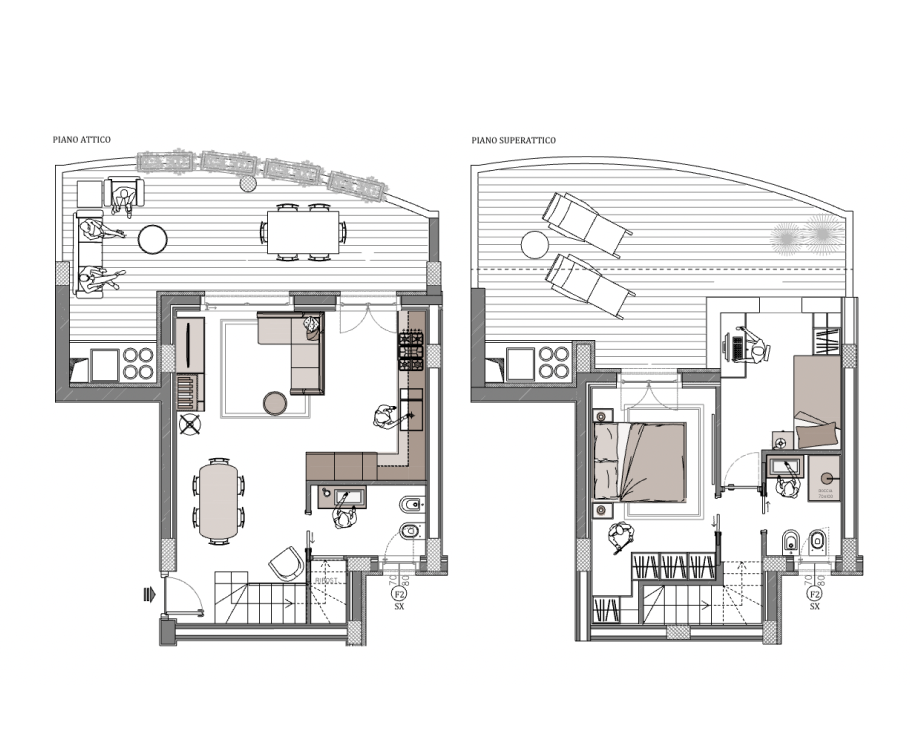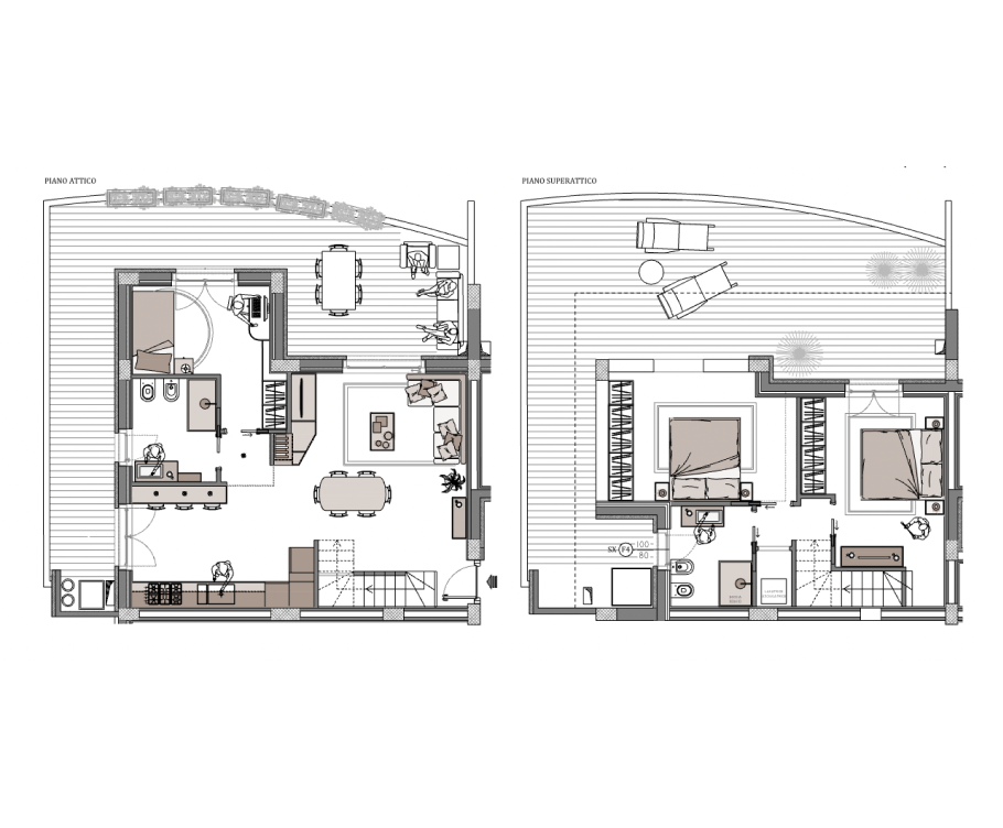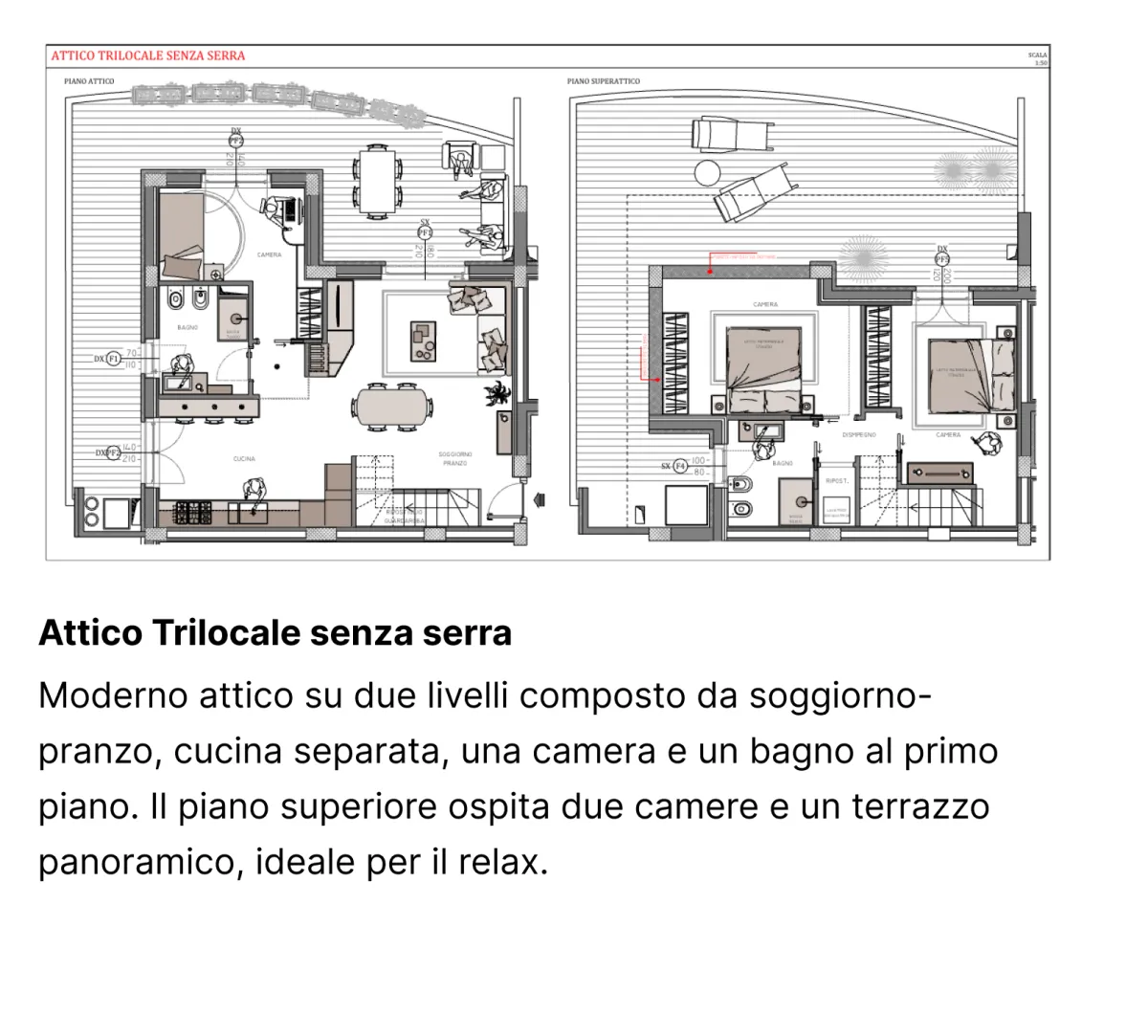 Con una superficie che varia dai 75 ai 100 mq, l’attico al terzo piano si compone di un ingresso, un ampio e luminoso salone, un bagno e un terrazzo, ideale per cenare all’aperto. Al quarto piano, due camere da letto e un secondo terrazzo panoramico, perfetto per godere di momenti di relax con una vista esclusiva.