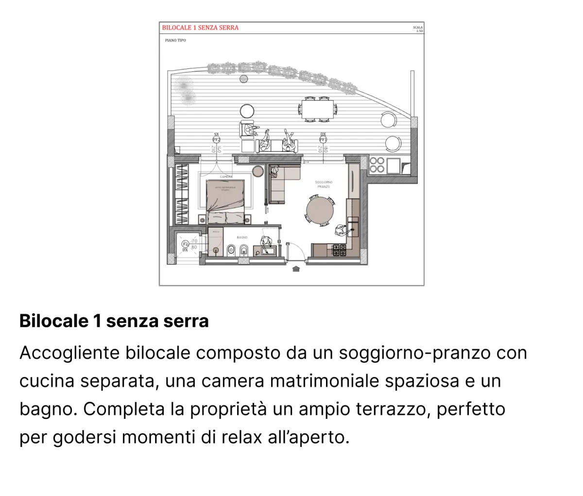 L'immobile si compone di un soggiorno accogliente con angolo cottura, una camera da letto, bagno e un ampio terrazzo, perfetto per i momenti di relax e di convivialità all'aperto.